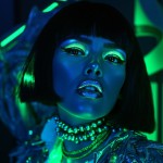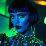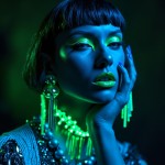 A futuristic high-fashion portrait of a model with deep metallic blue skin, sharp features, and glossy lips, illuminated by neon green and electric blue lighting. The model has a sleek, straight bob haircut with blunt bangs, glowing green eyeshadow, and wears elaborate beaded jewelry with sequins and fringe. Styled in avant-garde fashion with neon textures and shimmering accessories, set against a dark, moody background — ultra-detailed, cinematic lighting, editorial fashion photography style.