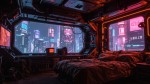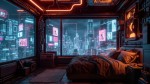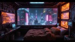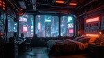 Cyberpunk Bedroom with Futuristic City View and High-Tech Interiors at Night