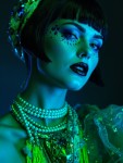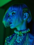 A futuristic high-fashion editorial portrait of a model with light blue eyes, deep metallic blue skin, sharp features, and glossy lips, illuminated by neon green and electric blue lighting. The model has a sleek, straight bob haircut with blunt bangs, glowing green eyeshadow, and wears elaborate beaded jewelry with sequins and fringe. Styled in avant-garde fashion with neon textures and shimmering accessories, set against a dark, moody background — ultra-detailed, cinematic lighting, editorial fashion photography style.