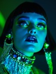 A futuristic high-fashion portrait of a model with light blue eyes, deep metallic blue skin, sharp features, and glossy lips, illuminated by neon green and electric blue lighting. The model has a sleek, straight bob haircut with blunt bangs, glowing green eyeshadow, and wears elaborate beaded jewelry with sequins and fringe. Styled in avant-garde fashion with neon textures and shimmering accessories, set against a dark, moody background — ultra-detailed, cinematic lighting, editorial fashion photography style.