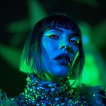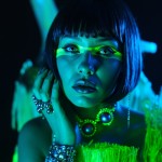 A futuristic high-fashion editorial portrait of a model with light blue eyes, deep metallic blue skin, sharp features, and glossy lips, illuminated by neon green and electric blue lighting. The model has a sleek, straight bob haircut with blunt bangs, glowing green eyeshadow, and wears elaborate beaded jewelry with sequins and fringe. Styled in avant-garde fashion with neon textures and shimmering accessories, set against a dark, moody background — ultra-detailed, cinematic rave lighting, editorial fashion photography style.