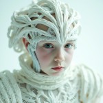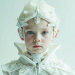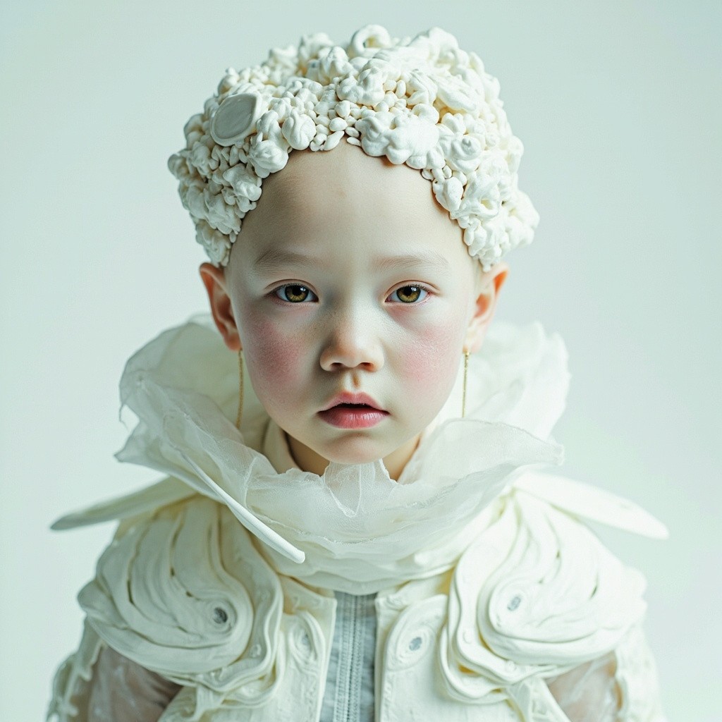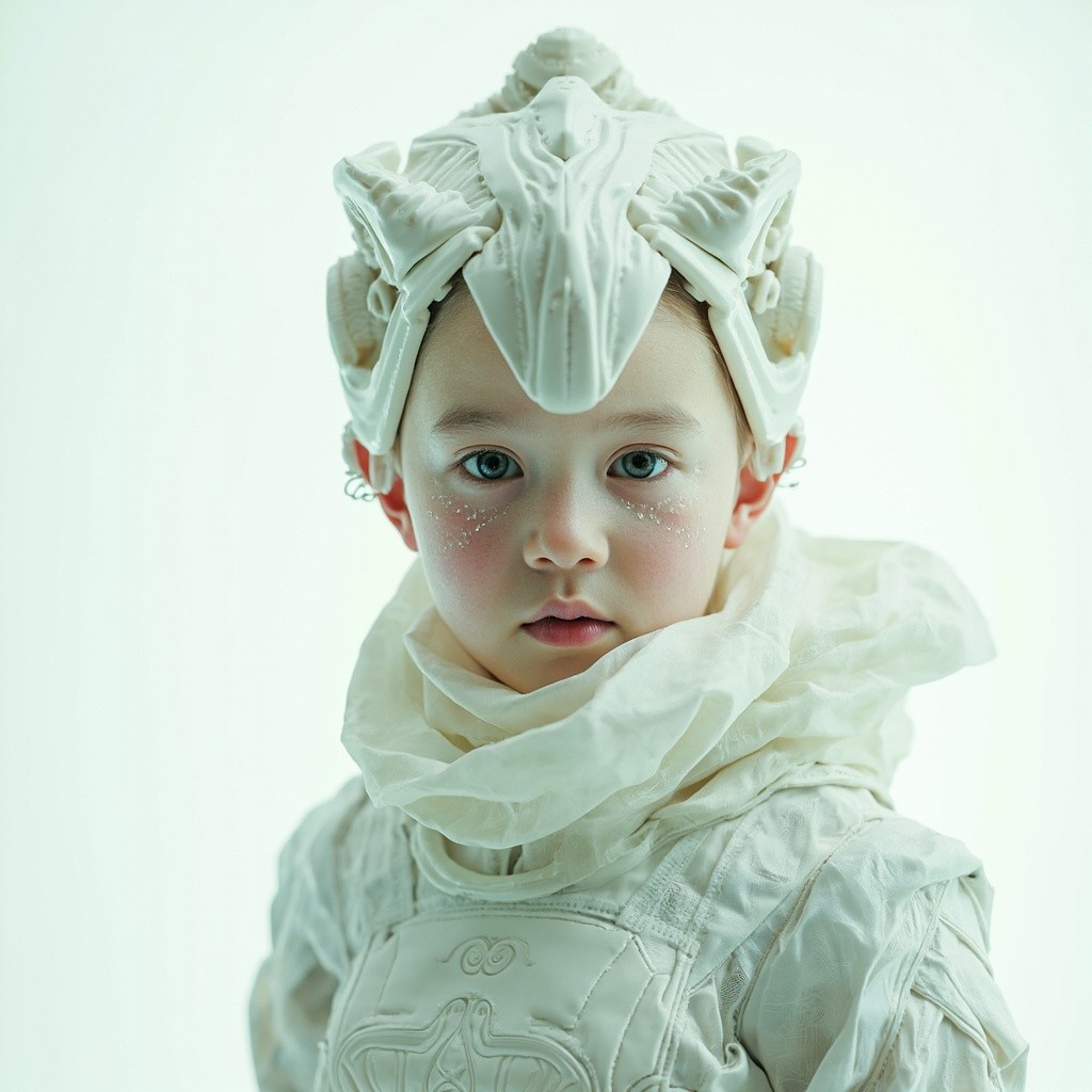 Futuristic Post-Human Child Portrait with Biomechanical Textures and White Avant-Garde Outfit