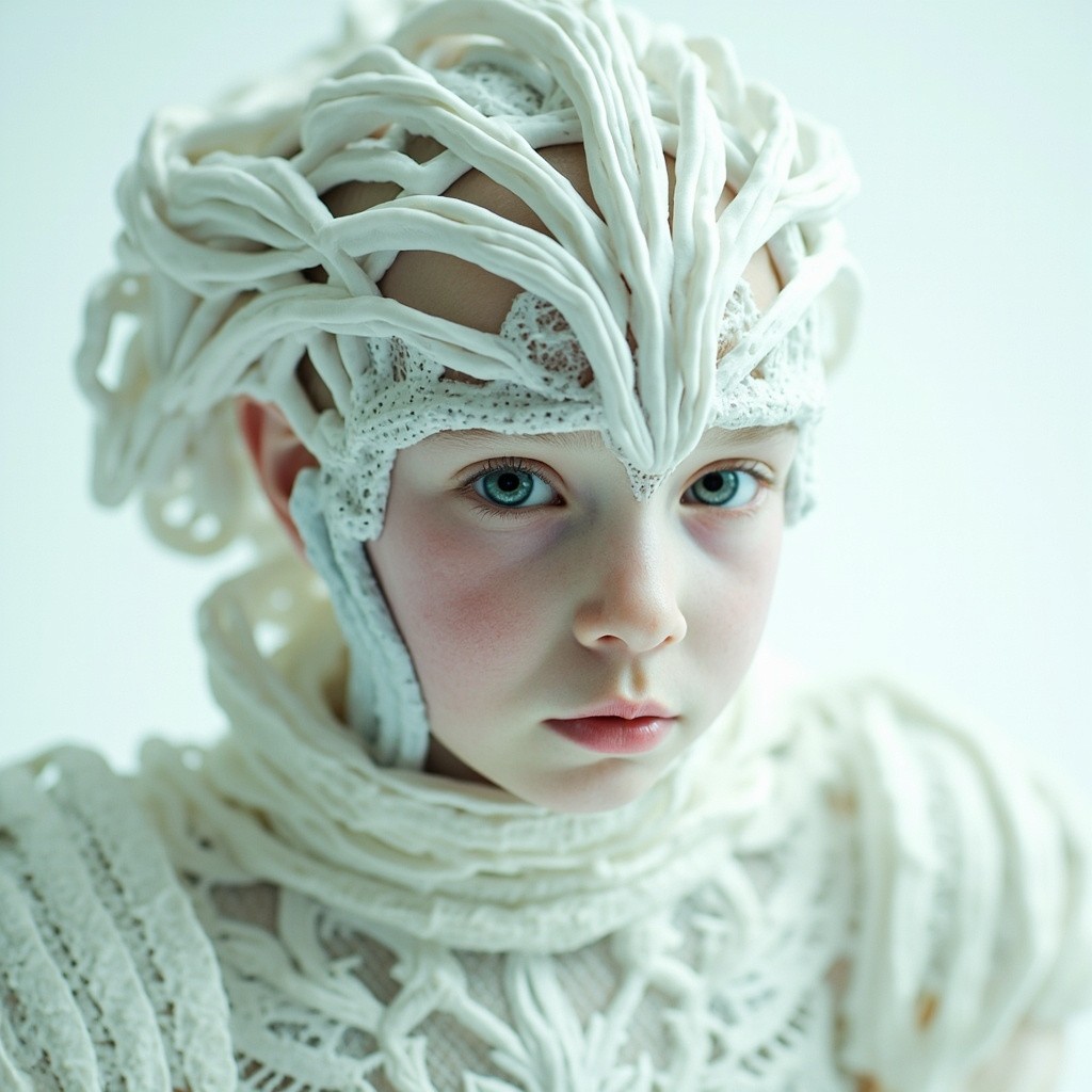A hyper-realistic, high-fashion portrait of a futuristic post-human kid about 12 years old mutant with smooth, pale skin and biomechanical textures integrated into the head and face. The subject wears an intricate, avant-garde white outfit with layered, sculpted fabrics and ornate patterns. The background is a soft gradient, emphasizing the surreal, ethereal presence. Photorealistic, cinematic lighting, sharp focus, and detailed textures.