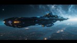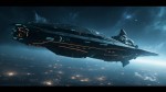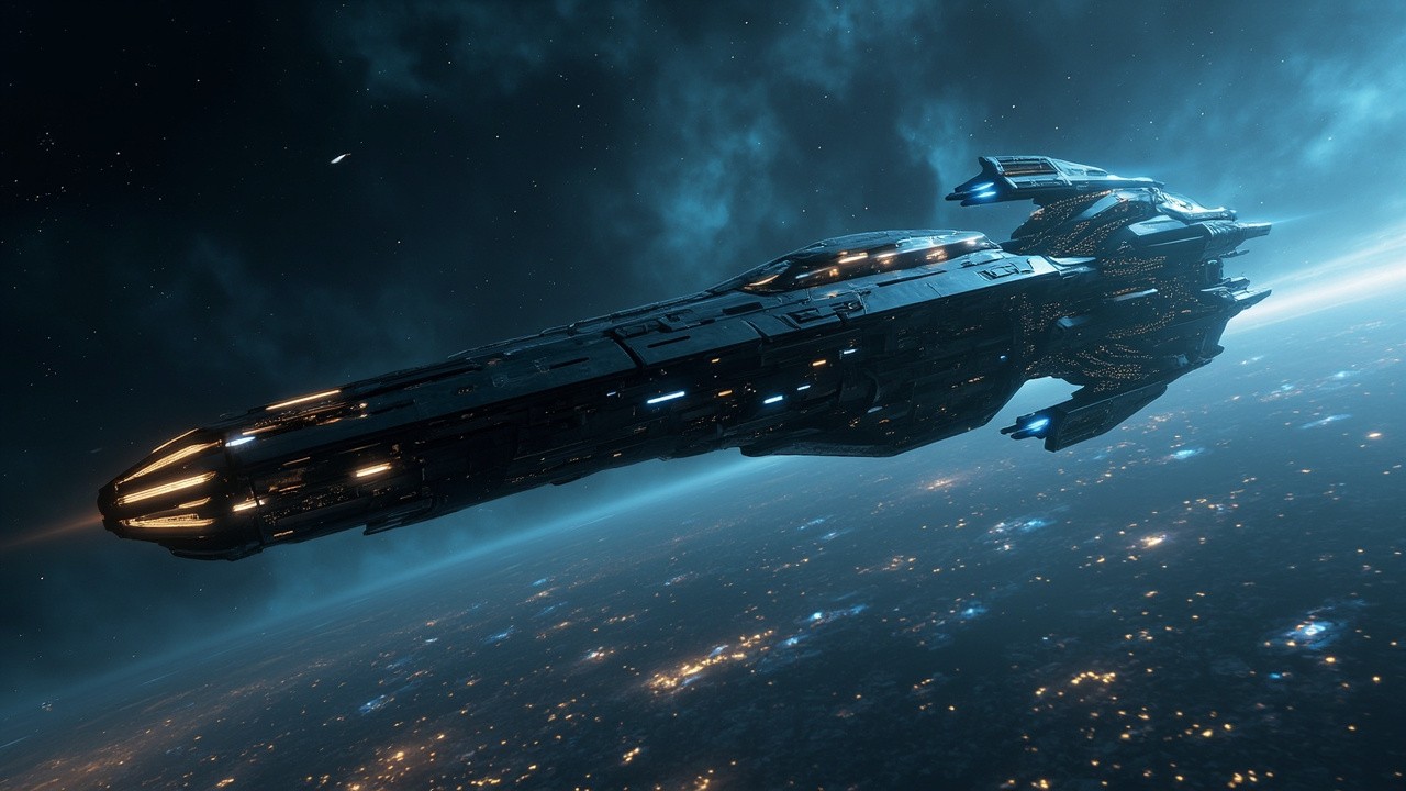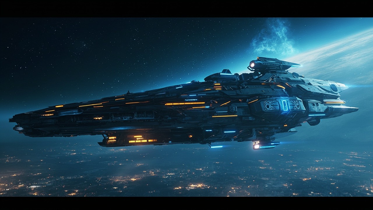 A massive, futuristic spaceship hovers above a sprawling alien cityscape at night, its metallic surface glowing with intricate blue and golden lights. The sky is filled with swirling nebulae and distant stars, casting a cosmic, ethereal glow across the scene. The ship's design is sleek and elongated, with complex mechanical structures and soft neon accents. Tiny city lights shimmer below, creating a grand scale and cinematic depth. Style: ultra-realistic, cinematic lighting, epic sci-fi, highly detailed, deep-space colors
