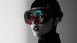 A black and white portrait of a futuristic woman with sleek features, standing confidently, wearing high-tech V-Ray style glasses with vibrant holographic colors as the only colored element, sharp lighting and soft shadows, monochrome sci-fi fashion, high contrast, studio-style dramatic composition, cinematic grayscale photography, minimalist futuristic background, glossy textures and fine details