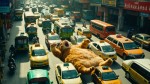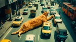 Giant Orange Cat Singing in Bangkok Traffic Jam, Sunny Day