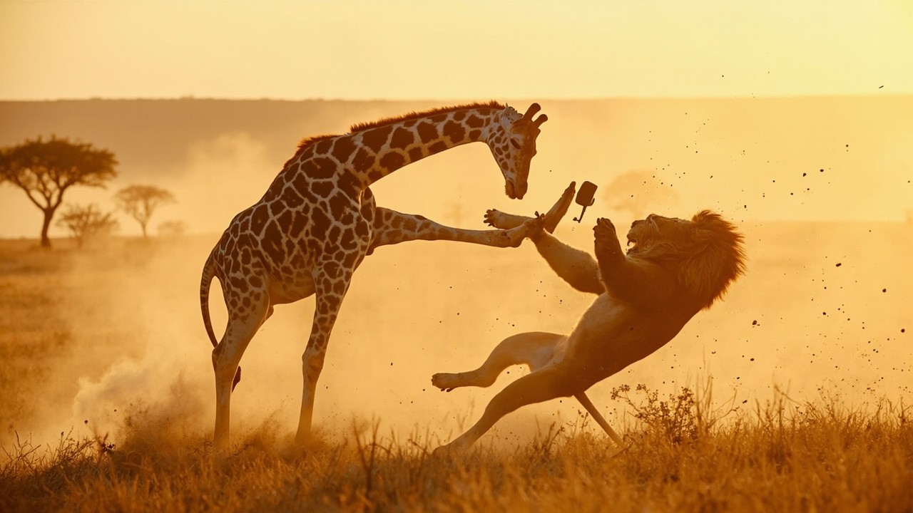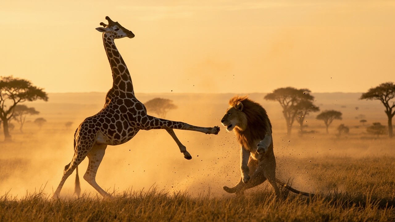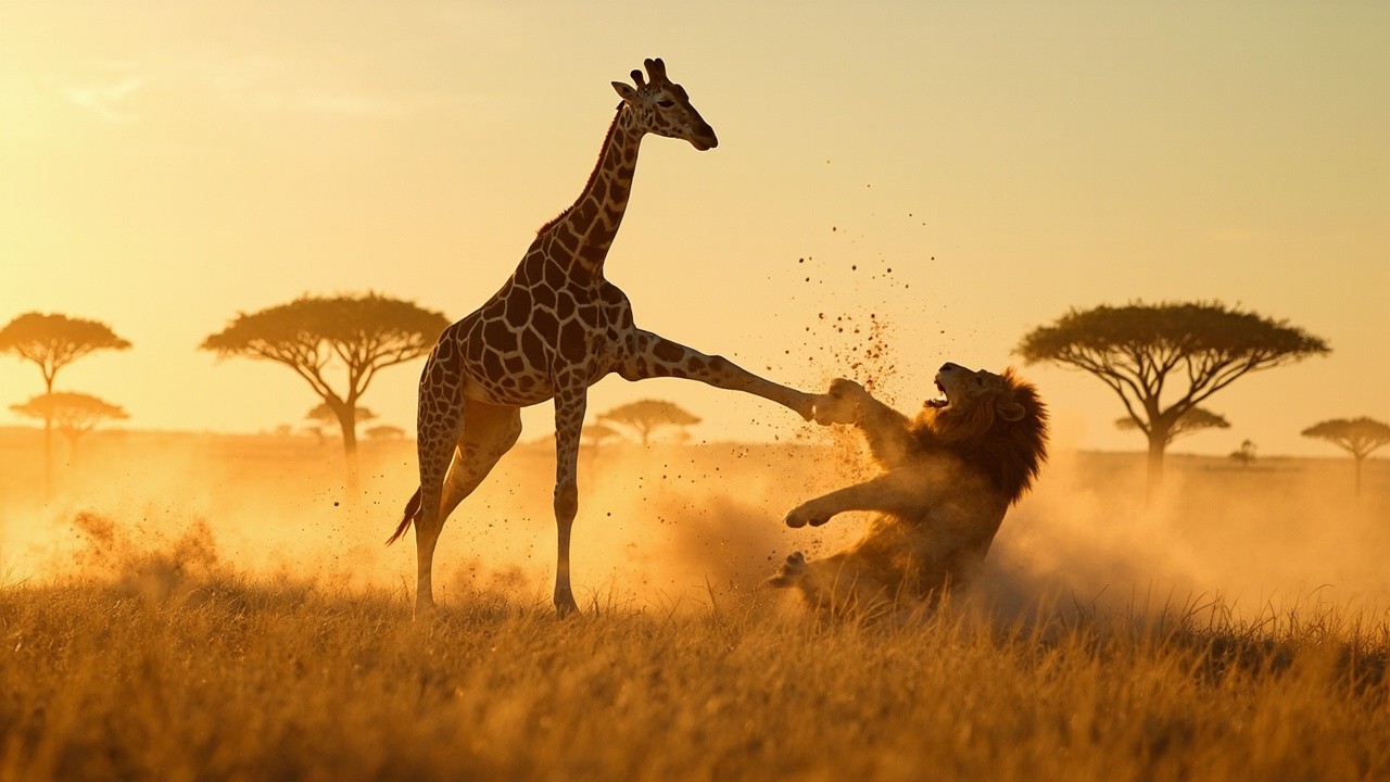 Adult Giraffe Kicking Lion in African Savanna Scene