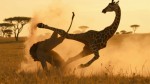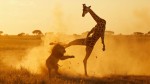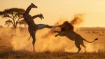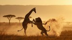 A realistic, high-resolution wildlife scene showing an adult giraffe defending itself by powerfully kicking a lion in an African savanna. The giraffe’s long leg is extended mid-kick, dust flying around, with the lion recoiling from the impact. The background shows golden grass, scattered acacia trees, and warm evening sunlight. The mood is intense, cinematic, and full of motion. Ultra-realistic detail, natural lighting, dynamic composition, 8K quality.