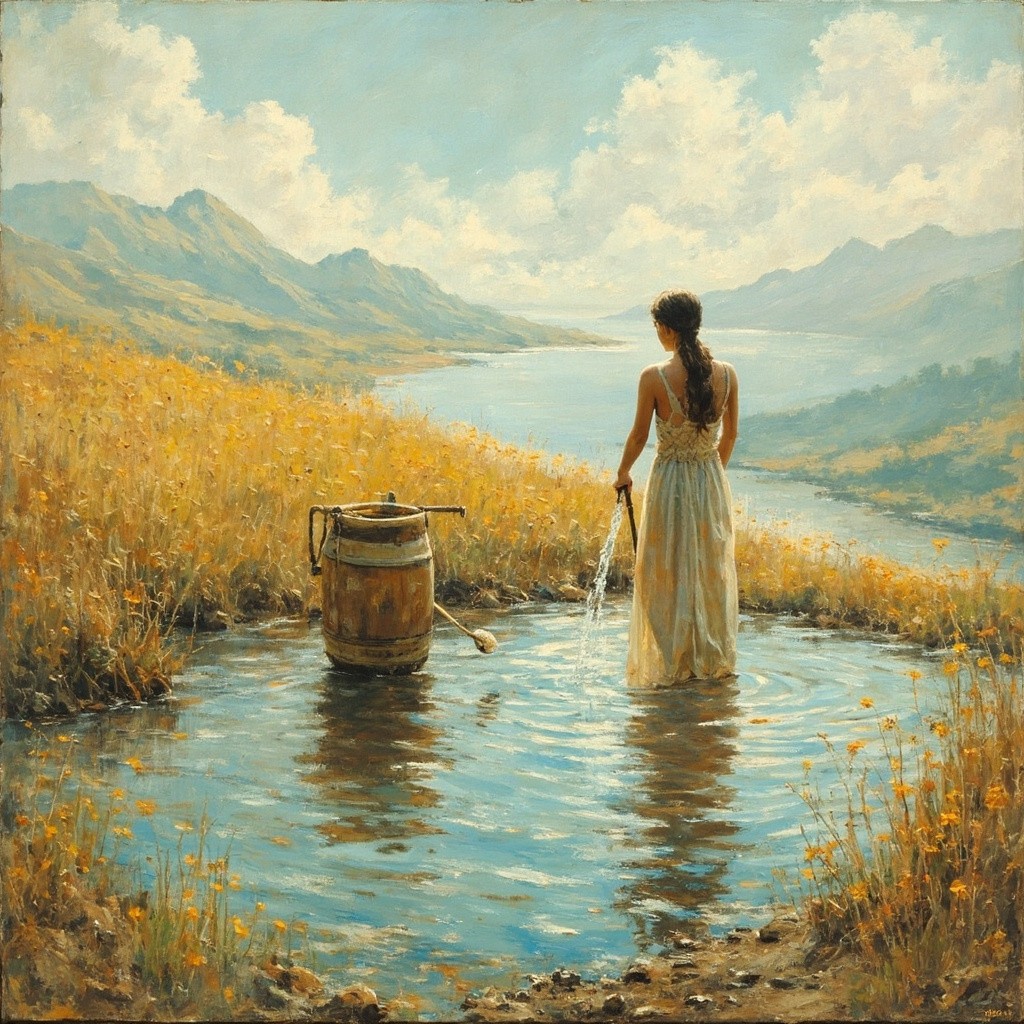 Girl Filling Water with Boy Watching From Distance