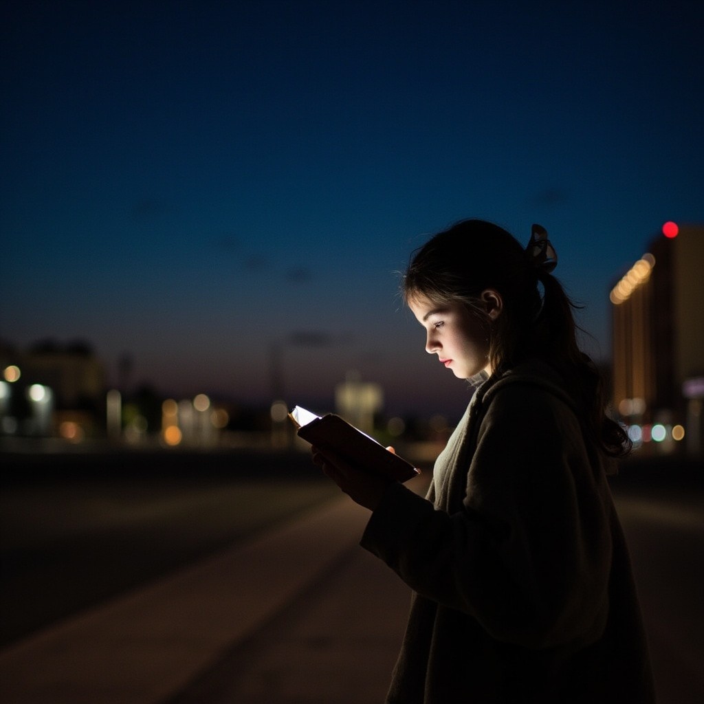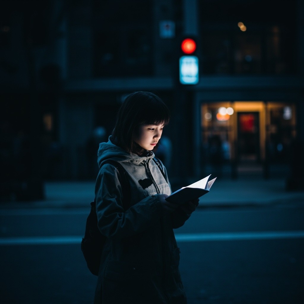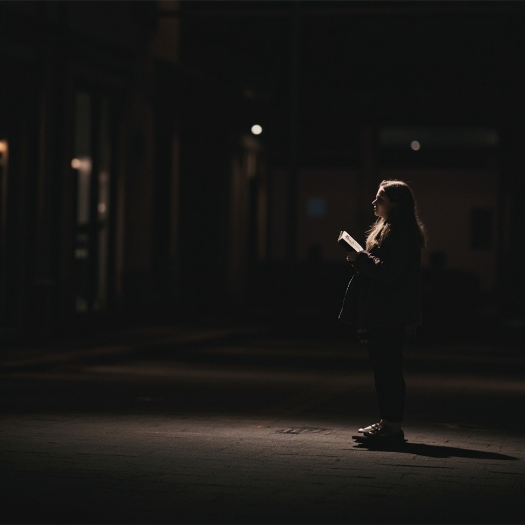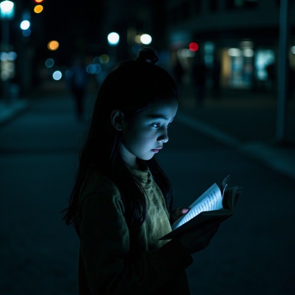 Girl Reading Book Walking at Night