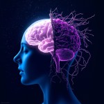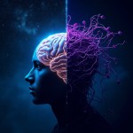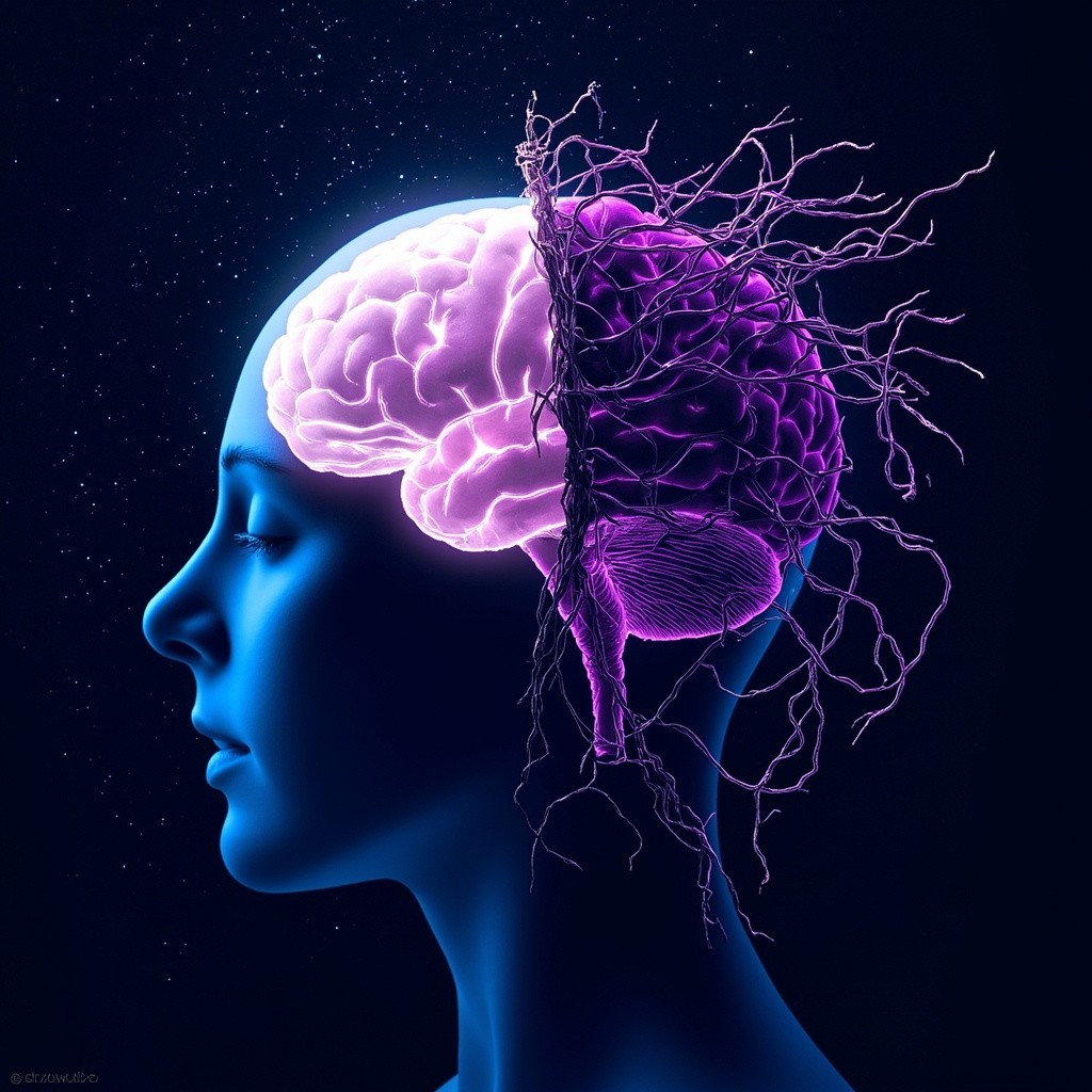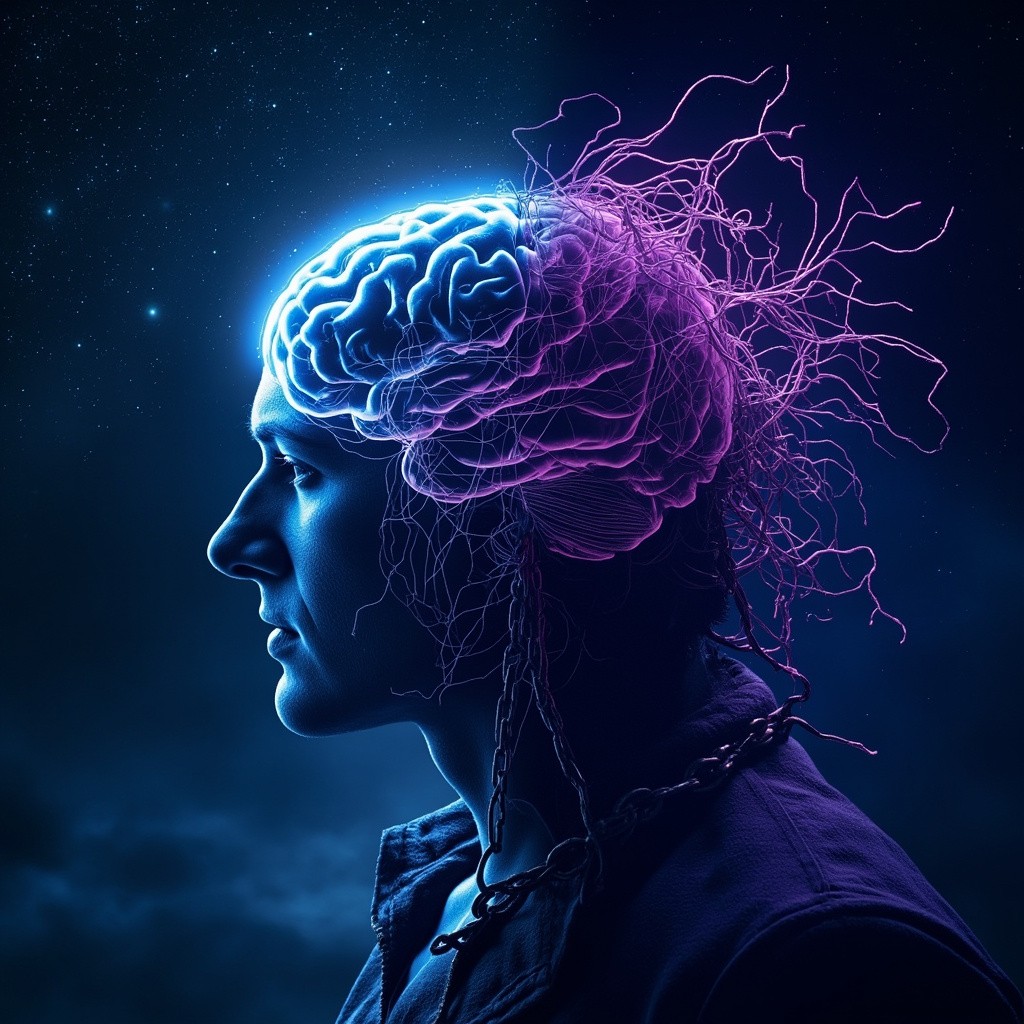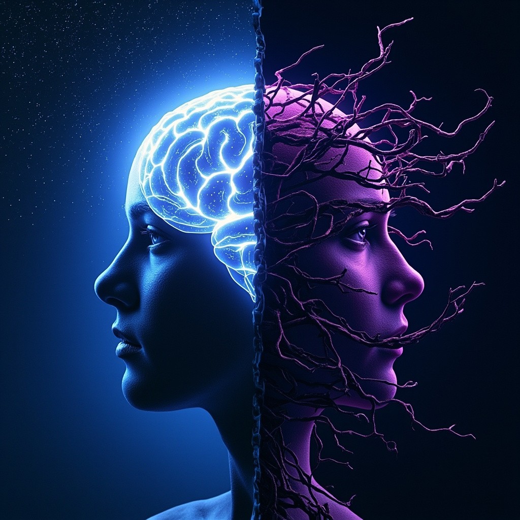 A dual-concept image: Left side is a glowing brain under a starry night, symbolizing inspiration and freedom (an antidote). Right side is the same brain entangled with withered vines and digital chains, symbolizing exhaustion (a poison). The style is surrealism, dark blue and neon purple, cinematic lighting. --ar 16:9