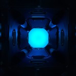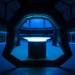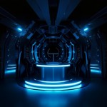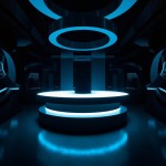 Black and Blue Technological Design with Glowing Cylindrical Countertop