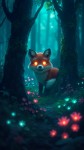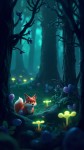 Mystical Forest with Bioluminescent Plants and Glowing-Eyed Fox