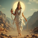 3D Goddess Brahmacharini Walking Barefoot with Rosary and Water Pot, Mountain and Ashram Background