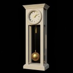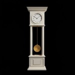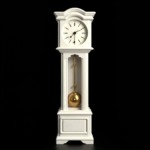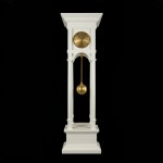 Hyperrealistic White Wood Grandfather Clock with Gold Components on Solid Black Background