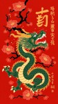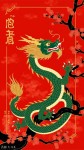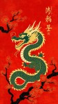A traditional Chinese-style illustration featuring a green and gold dragon with a snake-like body on a rich red background. The dragon has intricate scales, golden accents, a fierce expression with sharp teeth, and is surrounded by blooming red plum blossoms and black tree branches. Include faded Chinese calligraphy symbols in the background for a festive and cultural atmosphere. Style should be ornate, artistic, and inspired by classical Chinese New Year art.