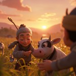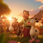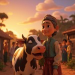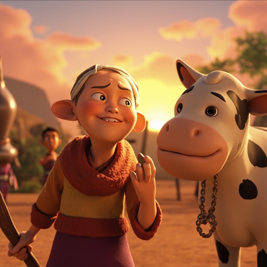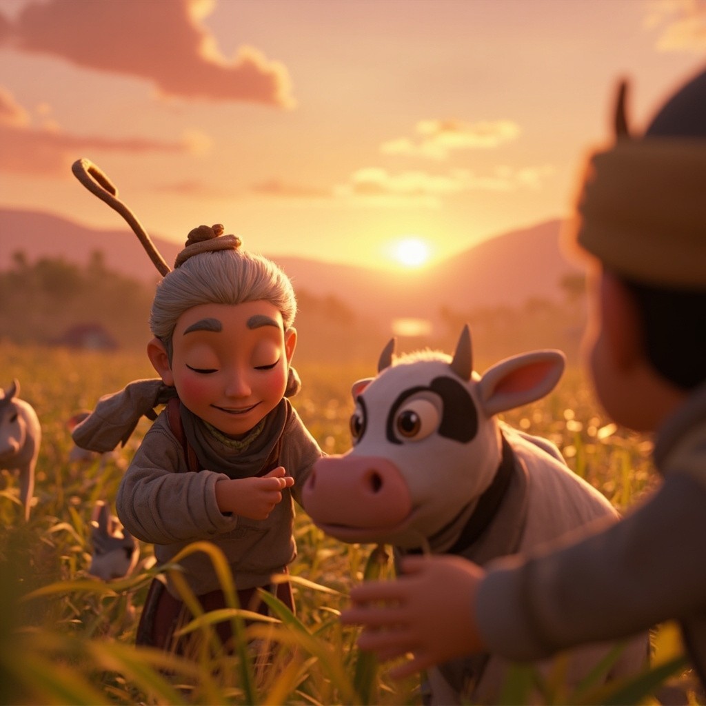 Peaceful Old Woman with Magical Cow in Happy Village Scene at Sunrise