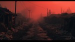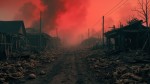 A destroyed, lifeless village consumed by devastation. The remains of collapsed wooden houses, shattered rooftops, and burned walls stretch across a bleak, ash-covered landscape. The entire ground is littered with countless human skeletons — bones scattered across roads, piled in corners, and overflowing from inside the ruined buildings. Some skeletons are slumped against broken fences, while others lie in unnatural positions as if frozen in their final moments. A thick fog rolls through the village, and a blood-red sky casts an eerie glow over the scene. The atmosphere is heavy, deathly silent, and unsettling. The image has a vintage horror aesthetic, with film grain, muted tones, and dramatic shadows — evoking despair, tragedy, and the haunting memory of mass death.