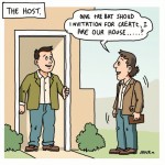 Smiling Homeowner Inviting Hesitant Guest at Doorway