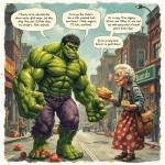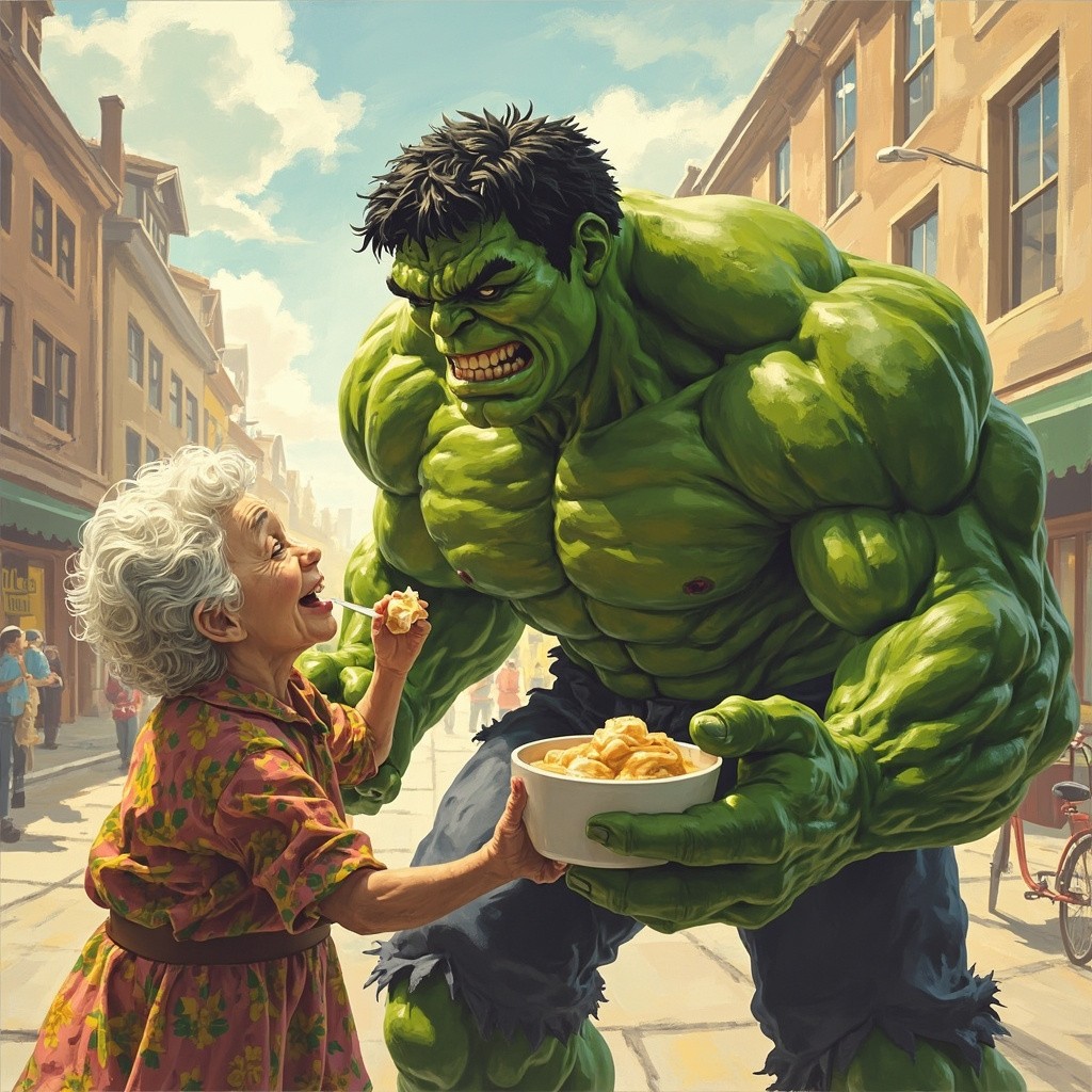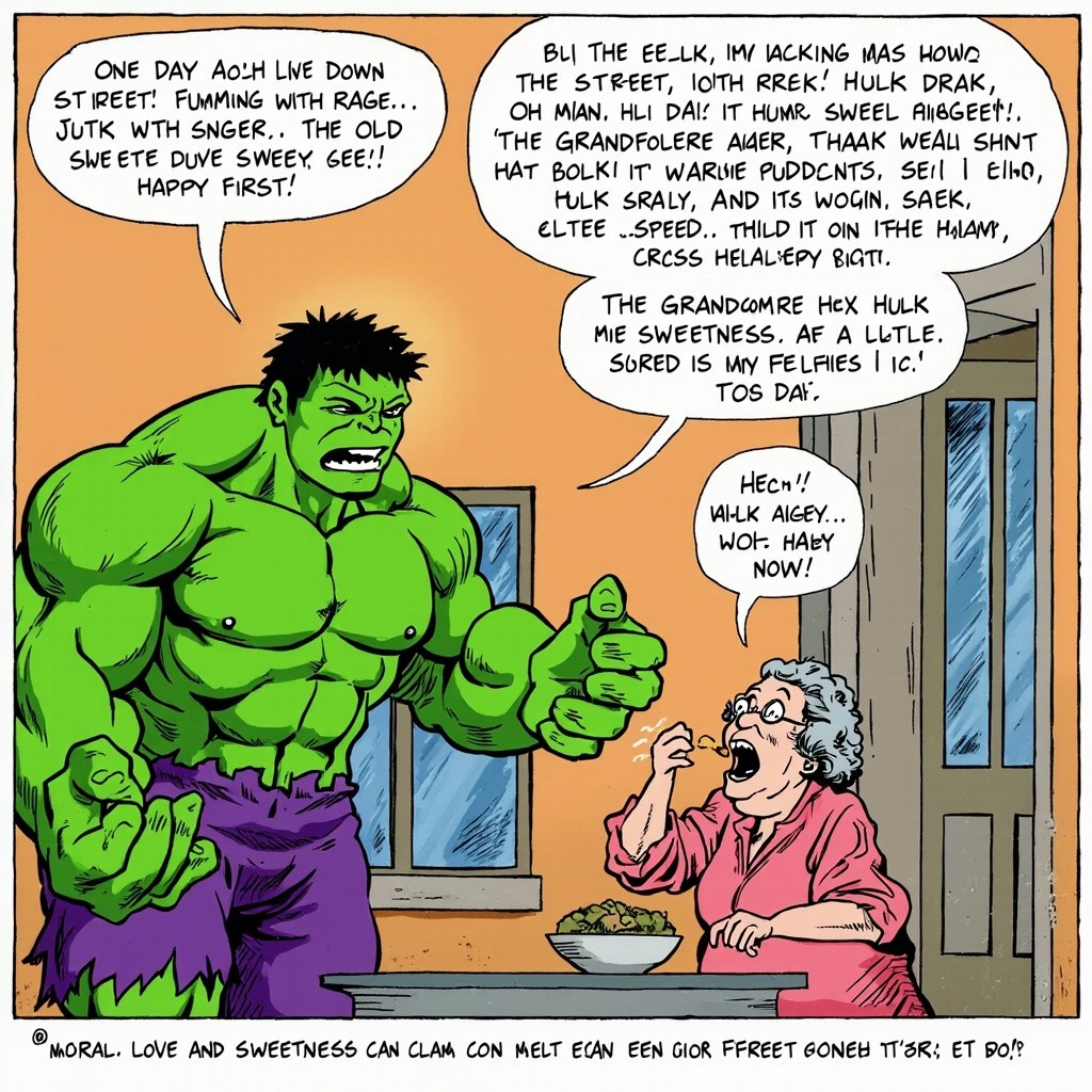 एक दिन Hulk गुस्से में सड़क पर चल रहा था। तभी एक बूढ़ी दादी बोली, “अरे बेटा, इतना गुस्सा क्यों? पहले हलवा खा लो!” Hulk बोला, “Hulk गुस्सा… Hulk smash!” दादी ने एक कटोरी गरम हलवा दे दिया। Hulk ने खाया… और अचानक मुस्कुराने लगा। Hulk बोला, “Wow! Hulk happy now!” दादी हँसकर बोली, “देखा बेटा, हलवा गुस्सा भी मीठा कर देता है!” Hulk बोला, “दादी… Hulk रोज हलवा खाने आएगा!” 😆 Moral: प्यार और मिठास से गुस्सा भी शांत हो जाता है। अगर चाहो तो मैं:
