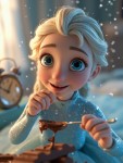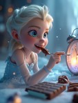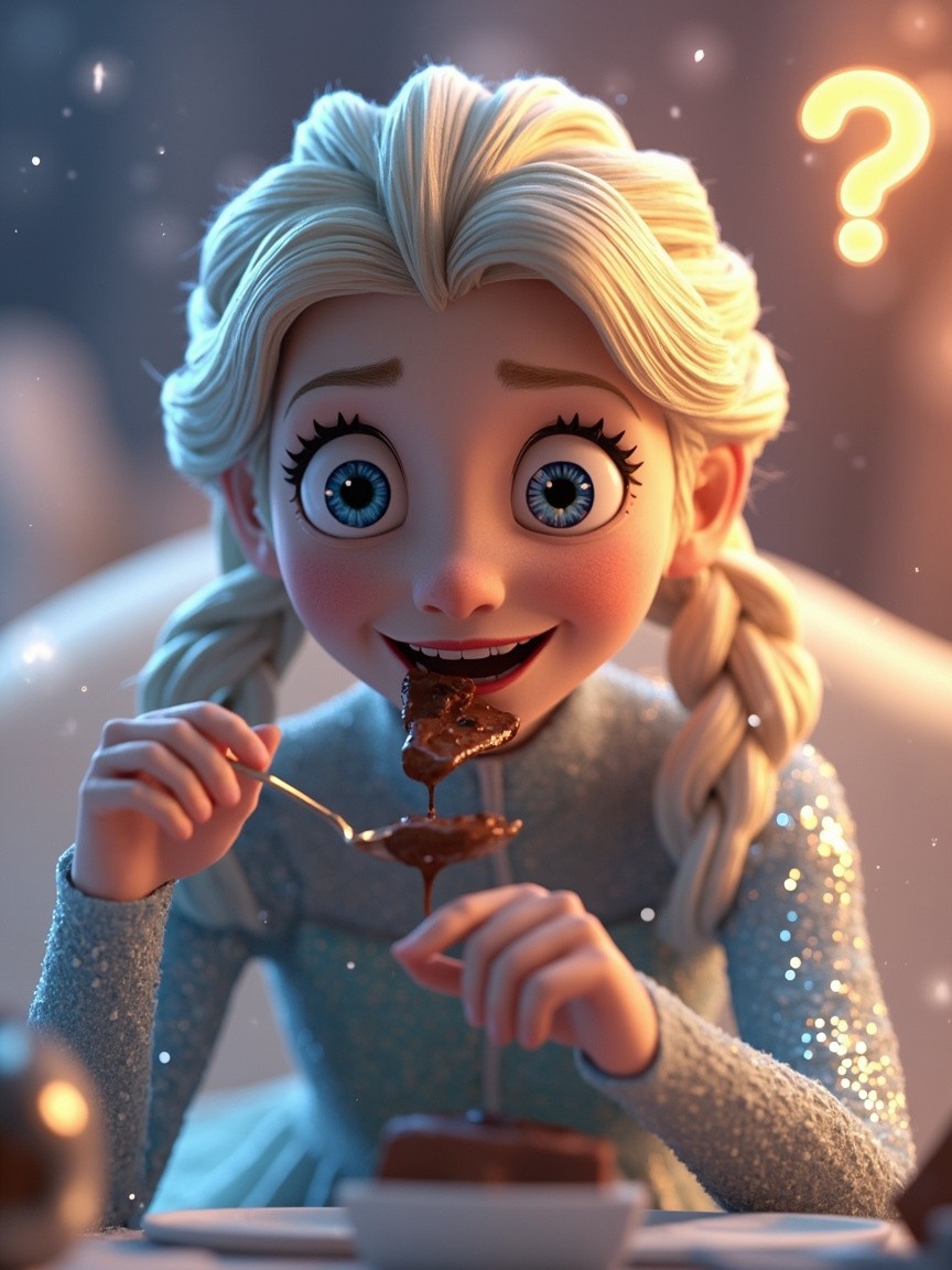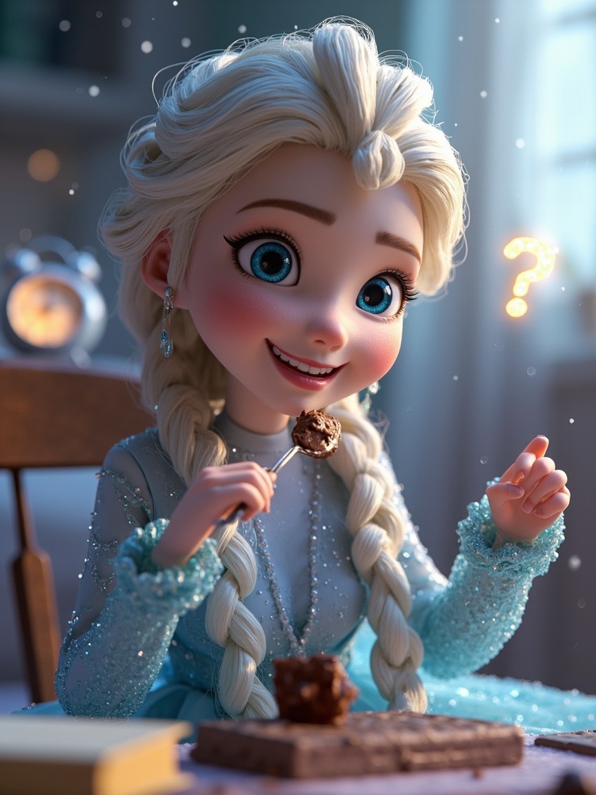 cinematic, animated short advertisement video featuring a beautiful ice princess, winter queen, frozen fantasy girl with platinum-blonde braided hair, sparkling blue eyes, and an elegant light-blue glittering dress. Soft icy glow, magical atmosphere, subtle snow particles. She is sitting happily in a cozy room, smiling while licking a spoon covered in melted chocolate. Dreamy lighting, warm and soft background, joyful expression. Suddenly, an alarm clock rings loudly. The dream scene fades. She wakes up suddenly, looking surprised. Lighting changes to natural morning daylight. She looks down and sees only a chocolate bar in her hand. Confused and playful expression. She picks up a spoon and tries to scrape chocolate from the bar. Close-up shot of spoon scraping chocolate. Soft sparkle effects. Camera zooms in on her face. She looks at the chocolate, then looks at the camera. Screen fades out with a glowing question mark “?” High quality animation, cinematic lighting, smooth transitions, 4K resolution, fantasy style, professional advertisement look, realistic expressions.