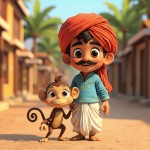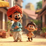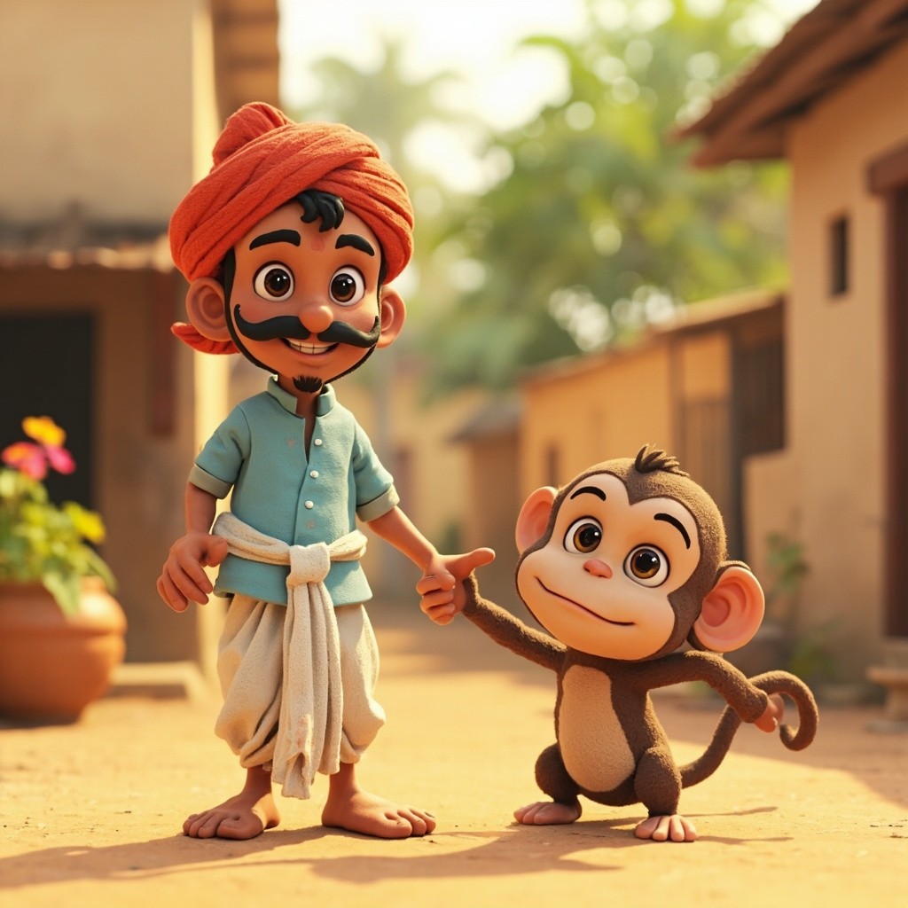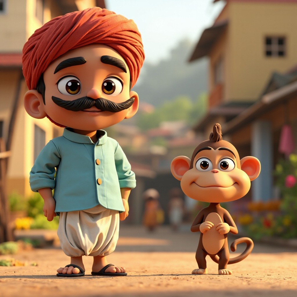 “Cute 3D cartoon style characters. A kind Indian farmer wearing a white dhoti, light blue kurta, red turban, black mustache, friendly face. A small brown mischievous monkey with big eyes and long tail. Bright colorful village farm environment, Pixar style cartoon, soft lighting, high detail, consistent characters.”