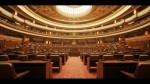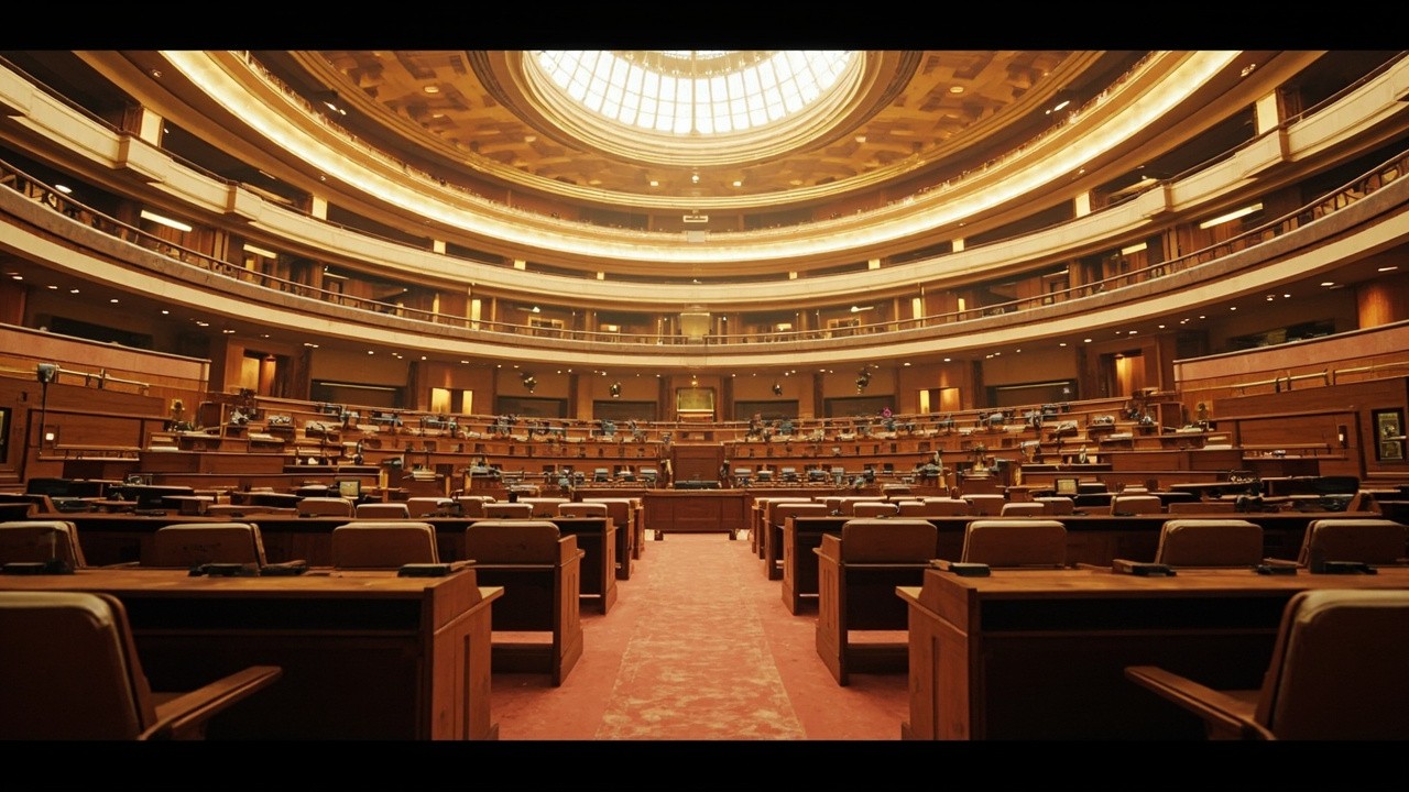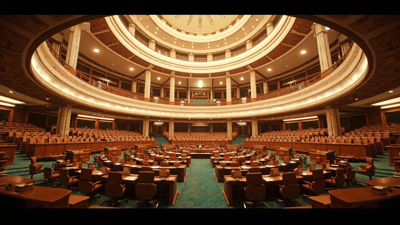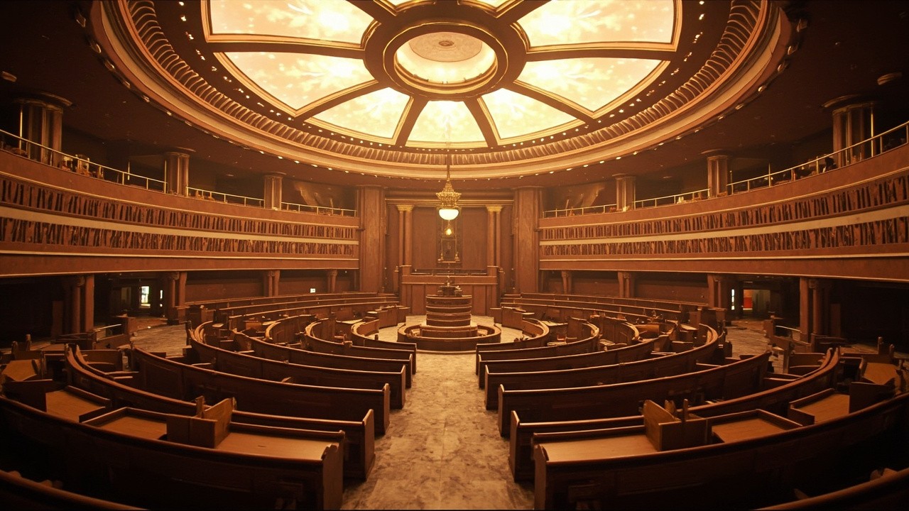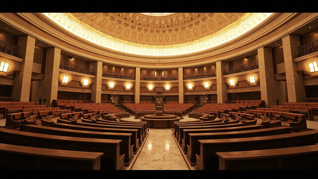 Indian Government Style Legislative Hall Interior with Dome Ceiling and Circular Seating
