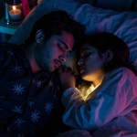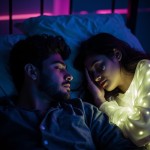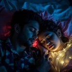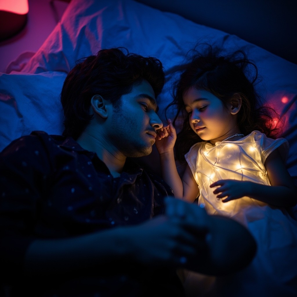 Indian Man Sleeping with Glowing Spirit Girl in Neon Lit Room