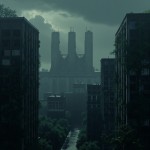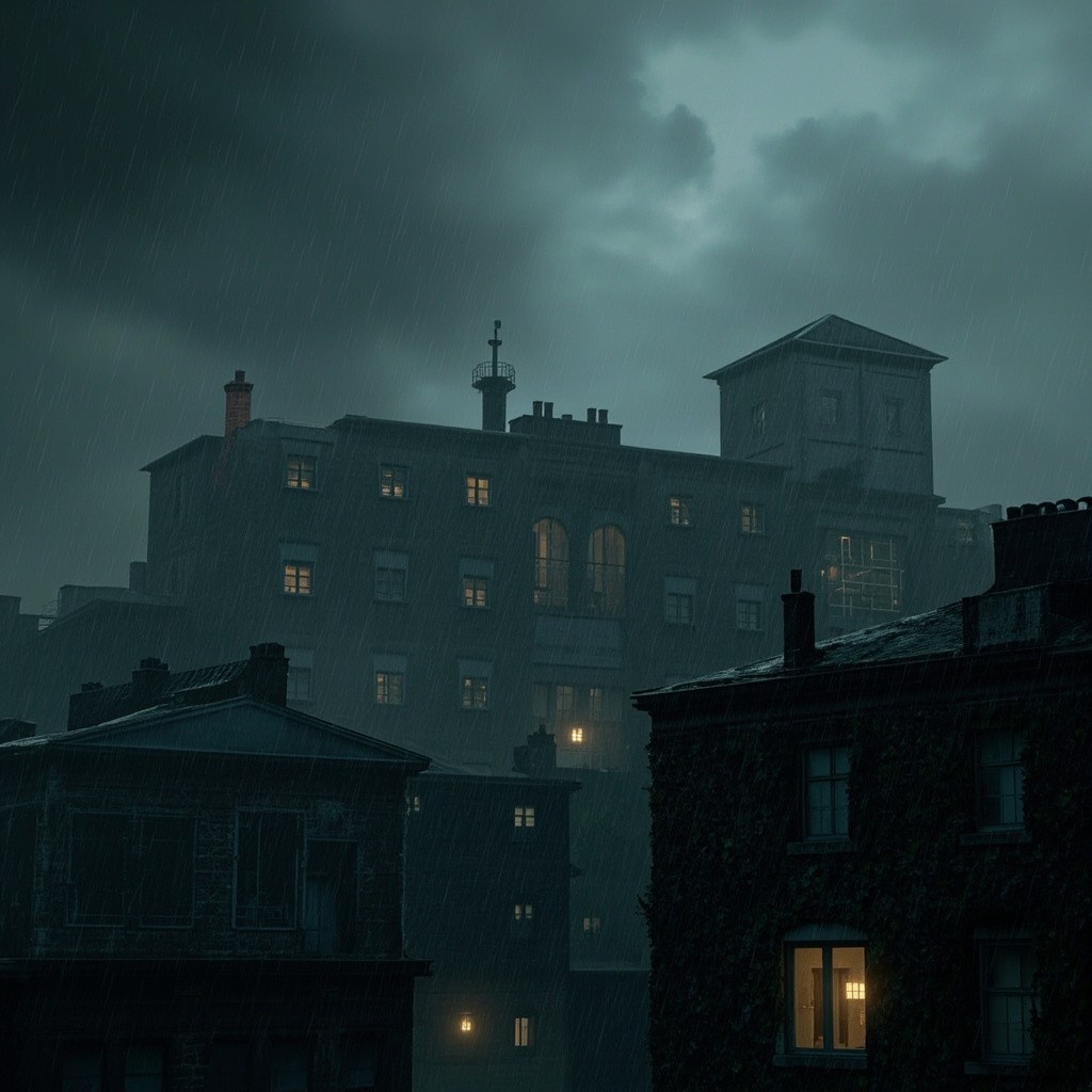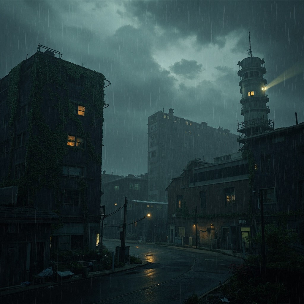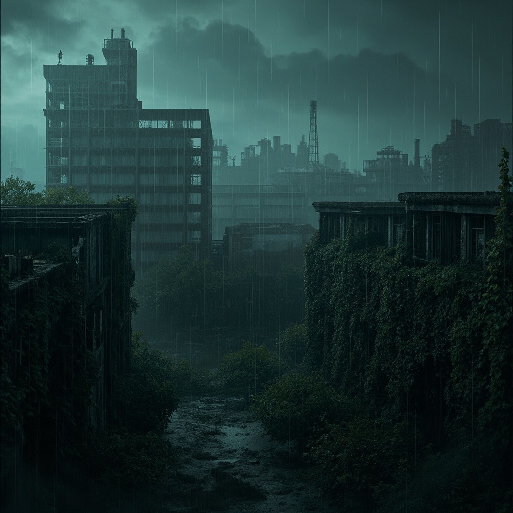 Industrial Building Complex with Ivy, Ash Rain, and Dark Sky Background