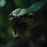 Close-Up of Venomous Snake Striking at Human, Jungle Background
