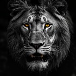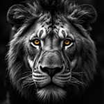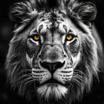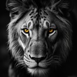 Close-Up Front View of Lion with Yellow Eyes, Black and White