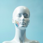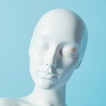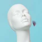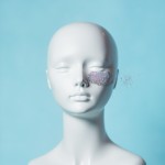 Porcelain Mannequin Face with Iridescent Eyeshadow Speck on Pastel Academic Blue Background