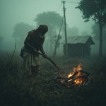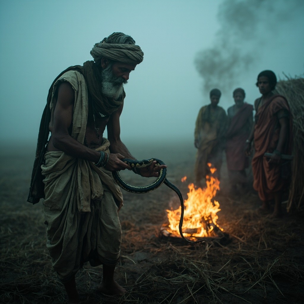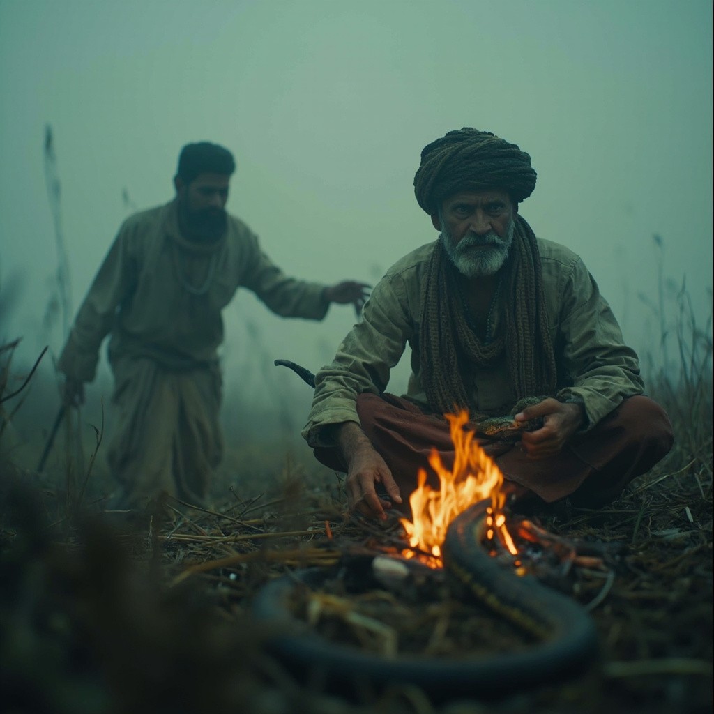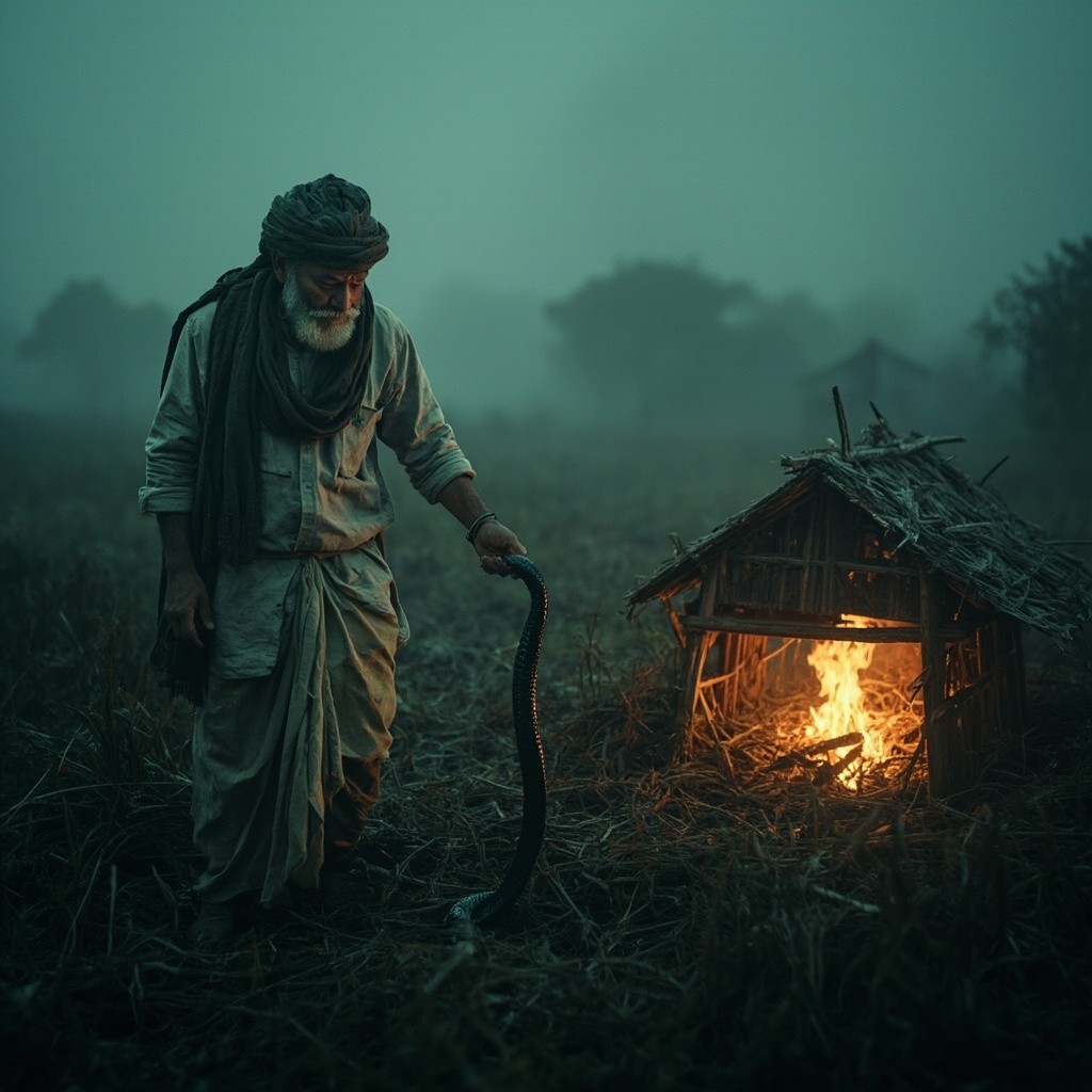 A cinematic Indian village story. A poor Indian farmer wearing dhoti and kurta working in fields in winter fog. He finds a frozen snake and helps it with kindness. Inside a small hut with fire, the snake regains strength. Suddenly the snake bites the farmer. Villagers rush to help, a traditional healer saves him. Moral story atmosphere, emotional, cinematic lighting, realistic style.