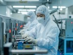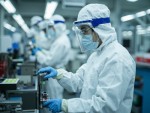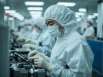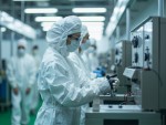 Korean Workers Operating Machinery in Cleanroom Factory Background