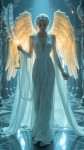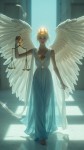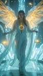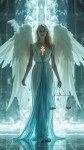 Libra Angel Walking in Crystal Court with Golden Scales and Outstretched Wings
