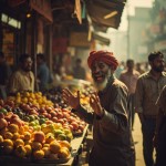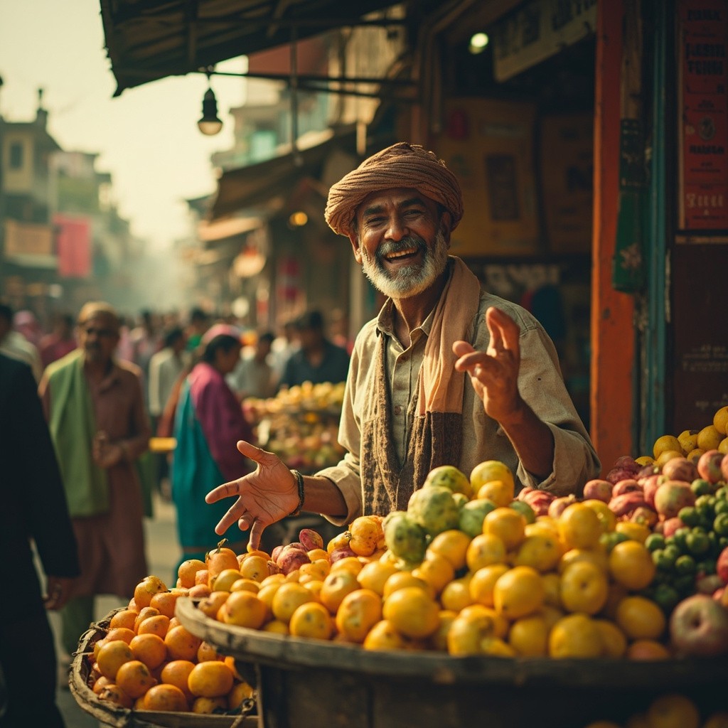 Indian Marketplace Scene with Smiling Fruit Seller and Vibrant Fruit Cart