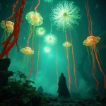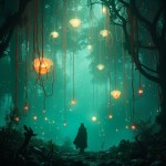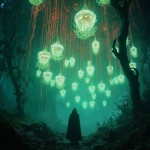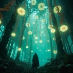 Surreal Sci-Fi Forest with Glowing Structures and Cloaked Figure