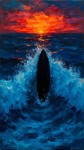 21h A black colour surfing board surfing the pacific ocean high swells. the board is in the center above a swell with the water in dark blue colour. The shot is taken from the beach showing the board surfing an incoming wave on its own without a surfer. a colourful dark sunset in the background on the horizon filling the sky with dark red, orange, blue and violet colours. The picture is a painting in henri matisse style.
