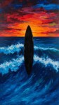 Black Surfing Board in Pacific Ocean Swell with Colorful Matisse-Style Sunset