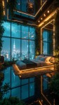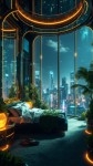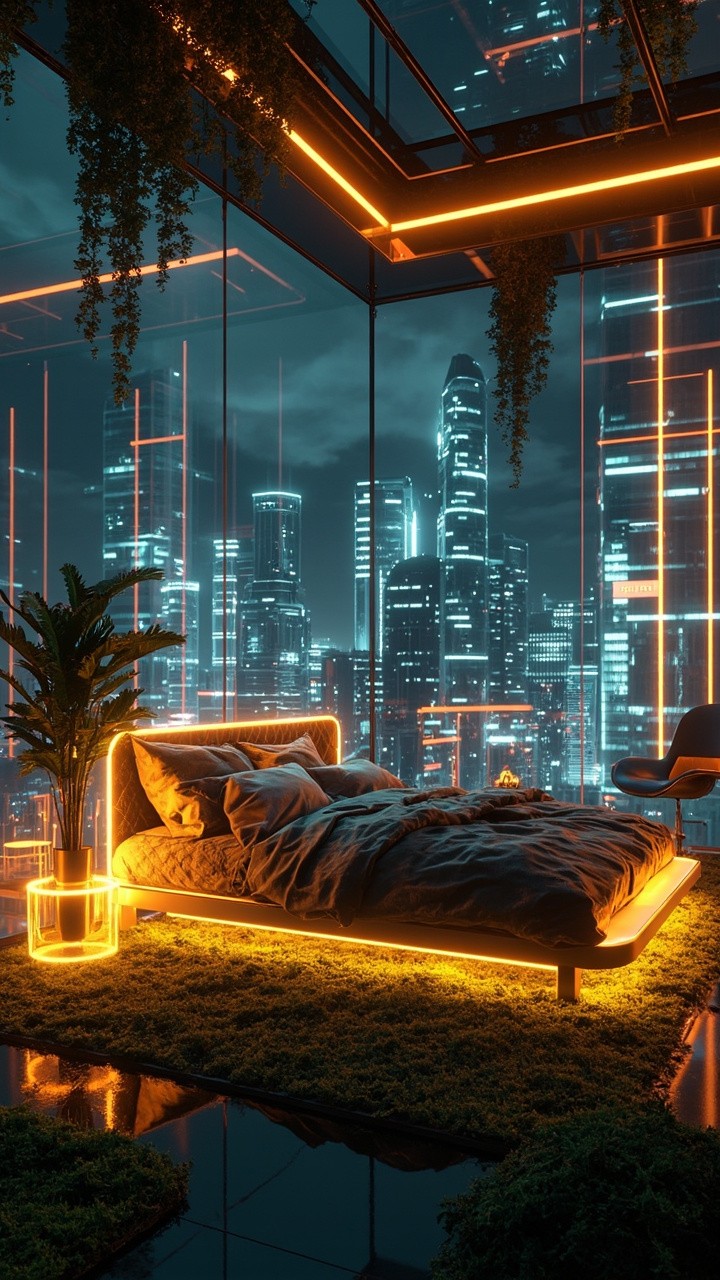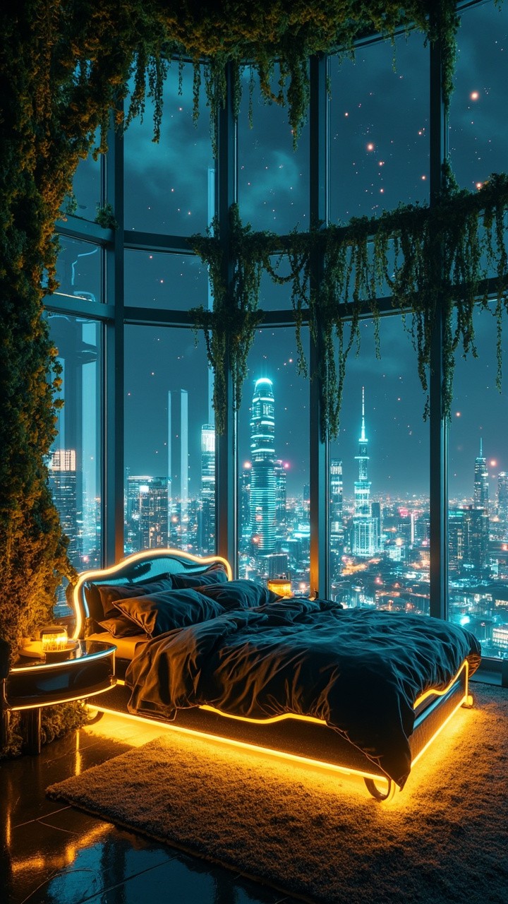 Luxury Futuristic Cyberpunk Bedroom with Neon City View at Night
