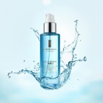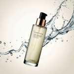 Luxury Skincare Bottle Splash Ad with Mid-Air Water Droplets