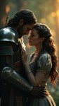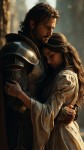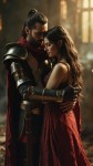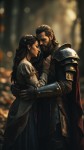 3D Full-Body Shot of Armored Warrior Embracing Beautiful Brunette Wife
