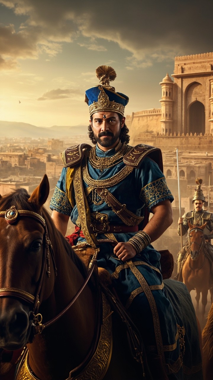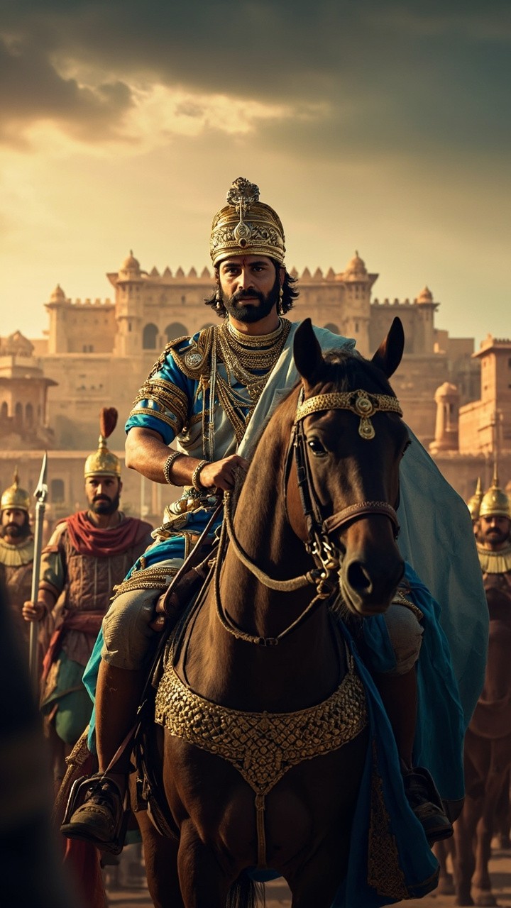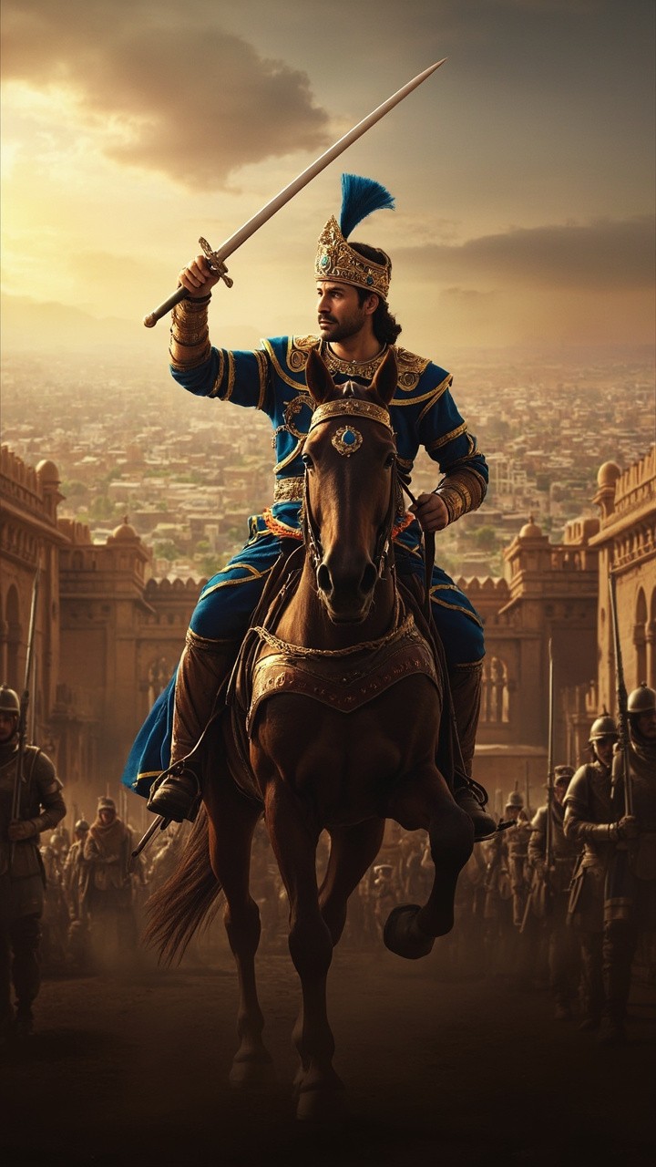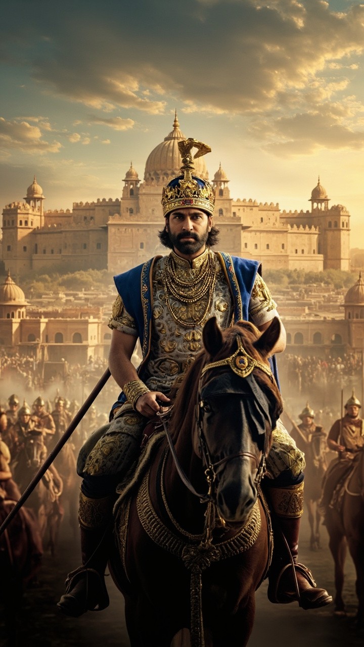 “Hyper realistic ultra HD scene of King Prithviraj Chauhan sitting on a horse, wearing royal blue and golden Rajput armor and crown, with soldiers standing behind him holding swords and spears. In the background the grand royal palace of Ajmer, Rajasthan with ancient Rajput architecture, big forts and sandstone walls. The city of Ajmer visible around the palace, dramatic sky, historical Indian king atmosphere, cinematic lighting, highly detailed.”