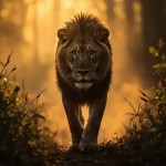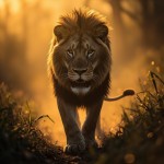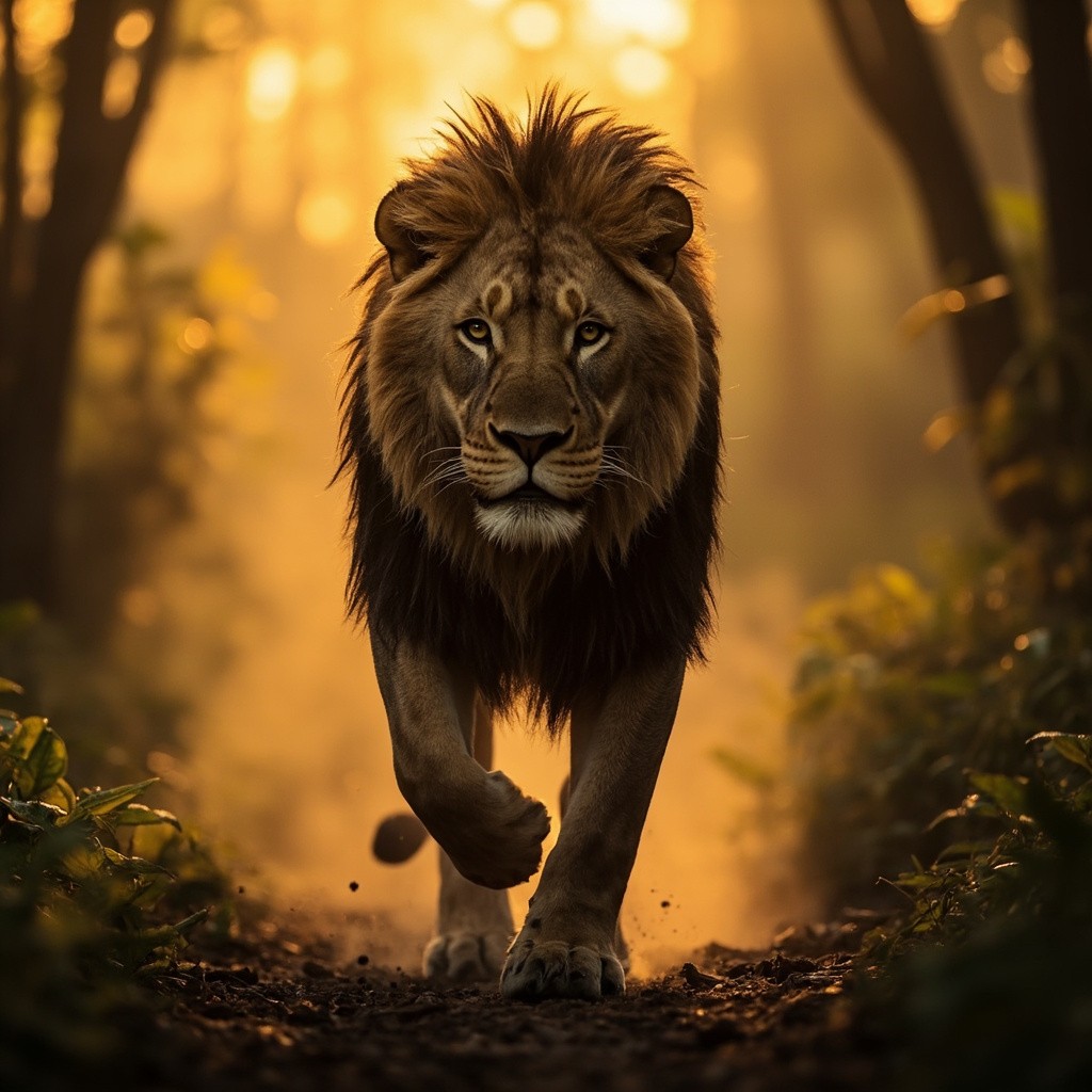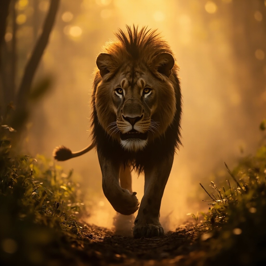 Powerful Lion Walking in Jungle with Golden Sunlight