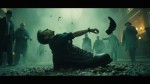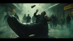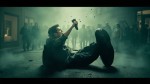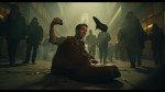 Cinematic Movie Poster of Young Man Emerging from Giant Shoe Throwing Miniature at Silhouettes