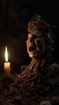 Macabre photorealistic sculpture of a mandrake root shaped like a gnarled, ancient homunculus. The "skin" is textured like old wood and damp soil, with tiny, fibrous roots resembling veins. It's half-buried in rich, dark earth inside a shadowy, candle-lit alchemist's workshop. The figure's face is frozen in a silent, agonizing scream. The lighting is dramatic chiaroscuro, with a single, flickering candlelight casting long, unsettling shadows. The atmosphere is thick with the smell of wet earth and decay. Hyper-detailed, 8K, cinematic horror.
