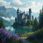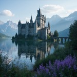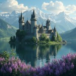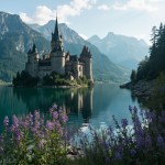 Medieval Castle Beside Lake and Mountains with Purple Flowers