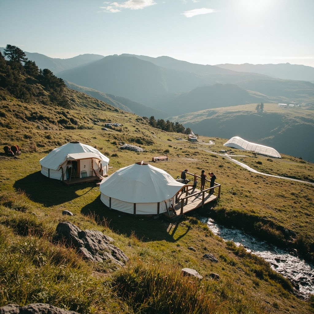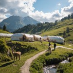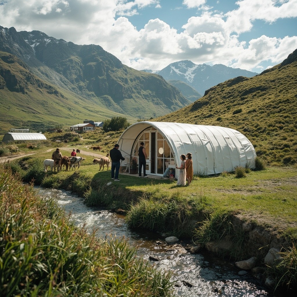 Modern Capsule Glamping in Mountains with Alpacas, People, Children, Landscaped Roads, Small River, Distant Strawberry Greenhouse, Horse Farm