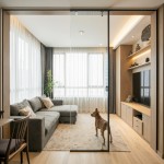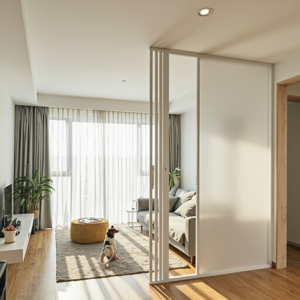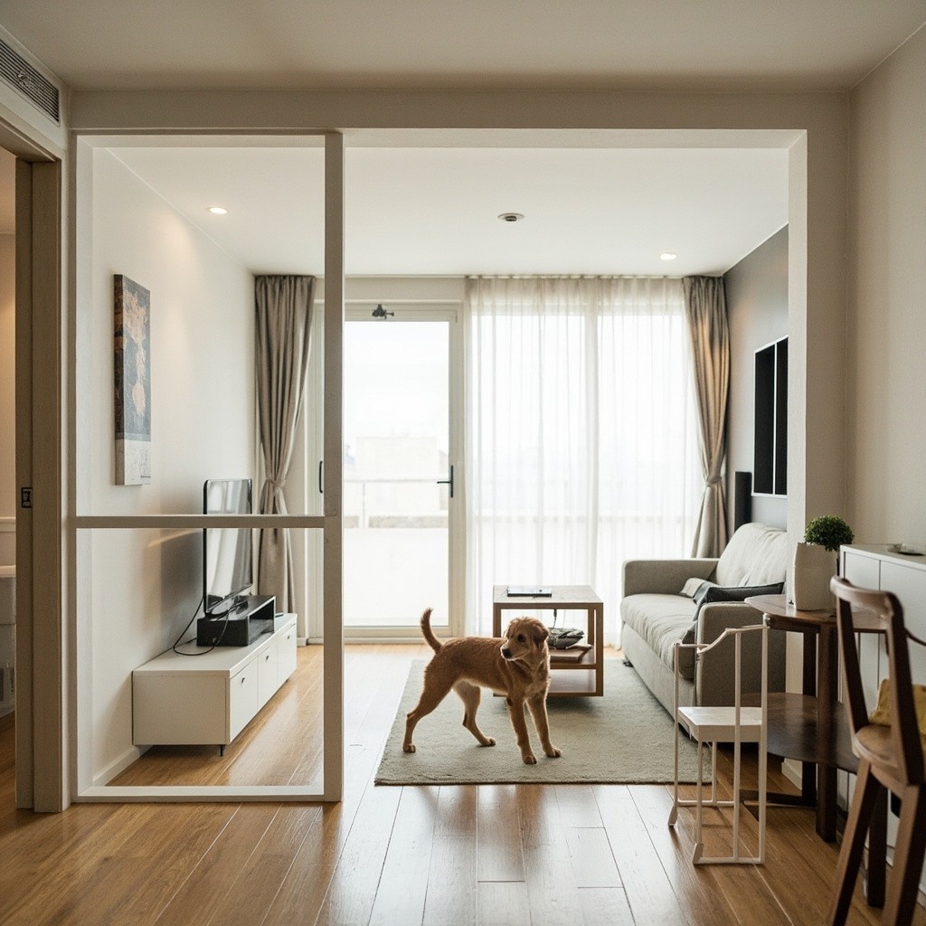 Contemporary Korean Apartment Interior with Freestanding Partition and Dog