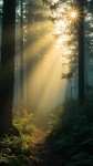 A serene early morning in a dense pine forest, with soft golden light filtering through misty trees. The ground is covered in dew-kissed ferns and moss, and a faint trail winds through the woods. Light fog hangs in the air, birds begin to stir, and everything is still and fresh, evoking peace and quiet awakening. Hyper-realistic lighting, cinematic atmosphere, ultra-detail.